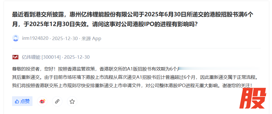 对此,亿纬锂能在深交所互动易回应称,根据香港监管政策,香港联交所的A1版招股书有效期为6个月,到期后需更新财务数据及其他信息,其后重新递交。由于目前市场环境下港股上市流程从首次递交A1招股书后计普遍超过6个月,因此重新递交属于正常流程。亿纬锂能表示,将按照香港联交所上市规则尽快安排重新递交上市申请文件,对公司整体港股IPO进程无重大影响。