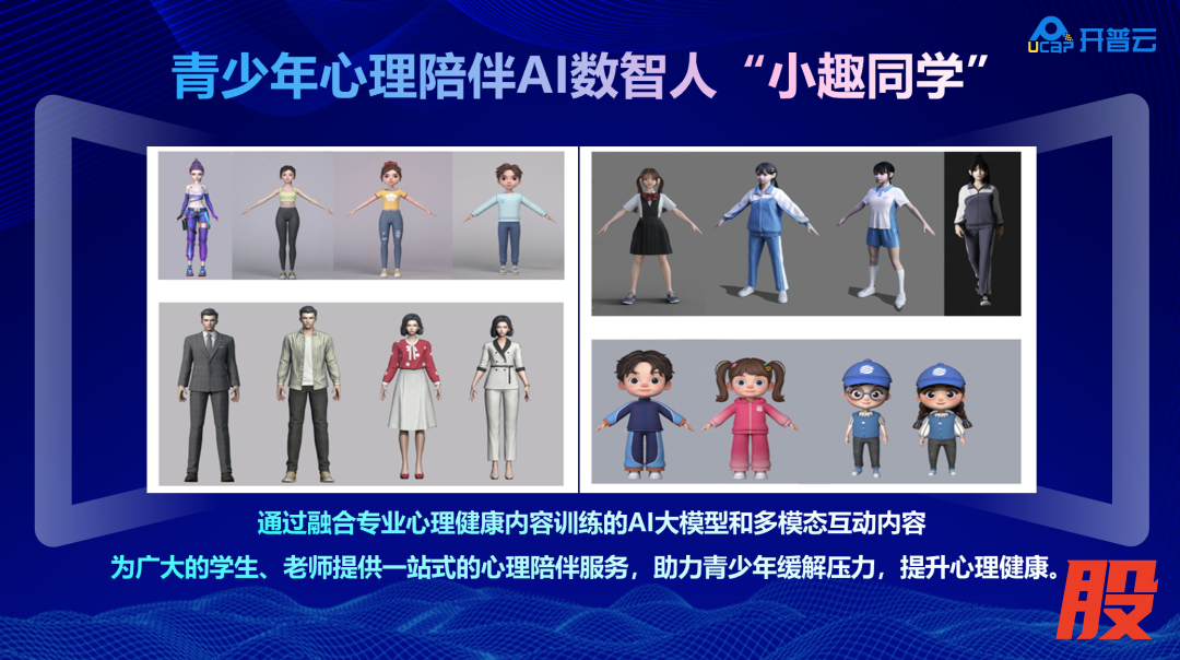 开普云子公司成都文趣星球推出的青少年心理陪伴AI数智人——小趣同学,旨在通过AI技术为青少年提供科学、专业、便捷的心理健康服务,其设计理念与《中国儿童发展纲要(2021-2030年)》提出的“构建儿童心理健康教育、咨询服务、评估治疗、危机干预和心理援助公共服务网络”等相关要求高度契合,已在著名学府成都七中(人工智能领域顶尖学者李飞飞教授母校)东部学校成功商用落地。