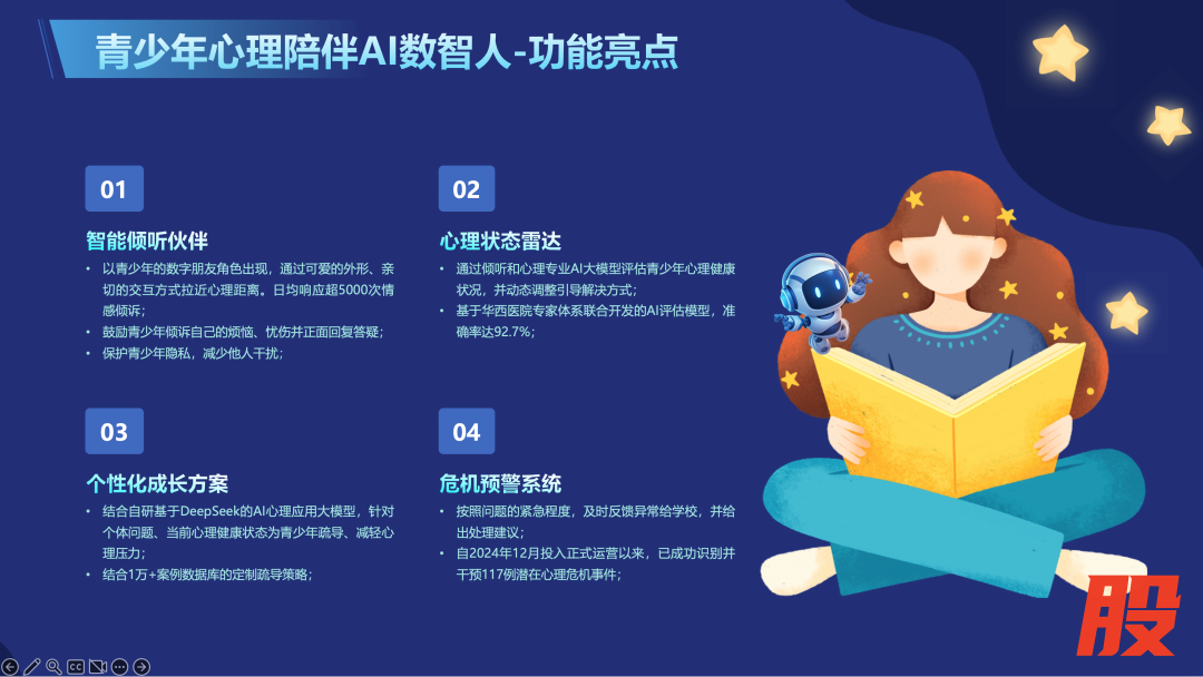 以青少年的数字朋友角色出现,日均响应超5000次情感倾诉,鼓励青少年倾诉烦恼并正面回复答疑,同时保护青少年隐私。