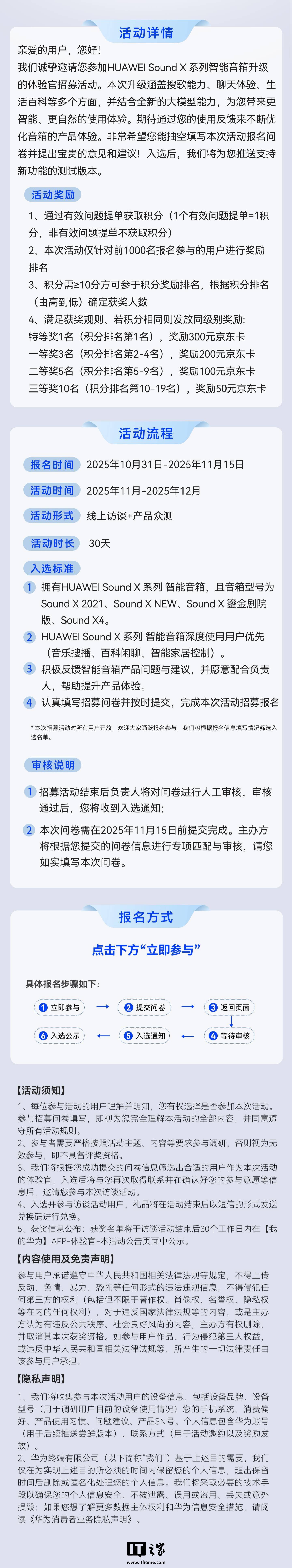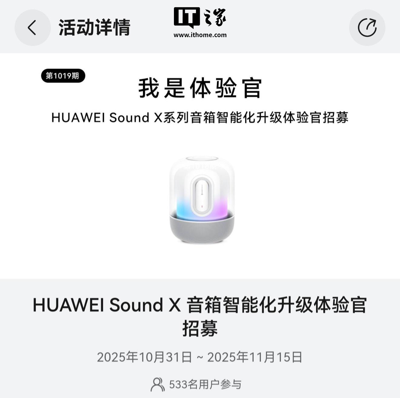 IT之家整理活动重点内容如下(活动路径:我的华为-首页-活动-体验官-HUAWEI Sound X 系列音箱智能化升级体验官招募):